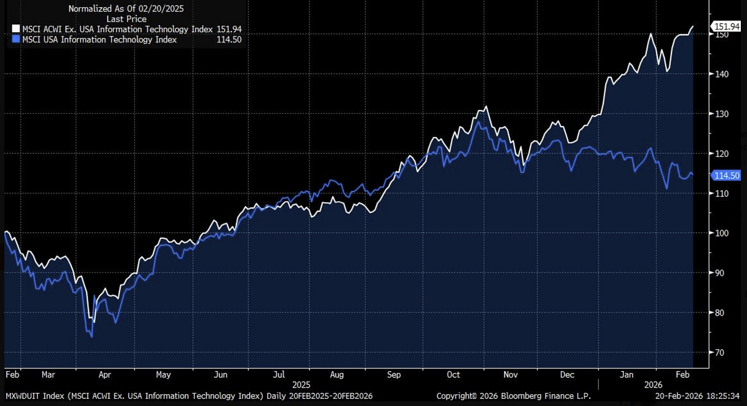 Global Tech vs US Tech: similarly, the chart below shows how rest-of-world tech continues to push higher (new highs last week), while US tech pretty much looks to be in a downtrend at this point.