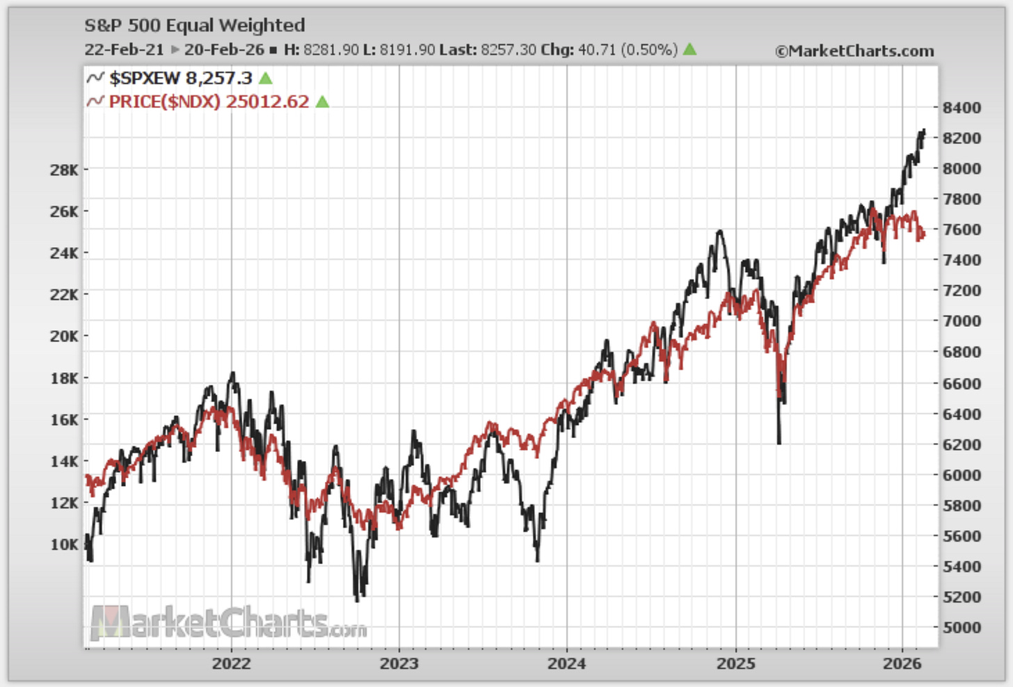 The divergence here and above still has a bullish/constructive hue to it in that you have the rest of the market + global looking good, doing well in absolute terms (for good reason) —and taking up the slack from softer tech performance.