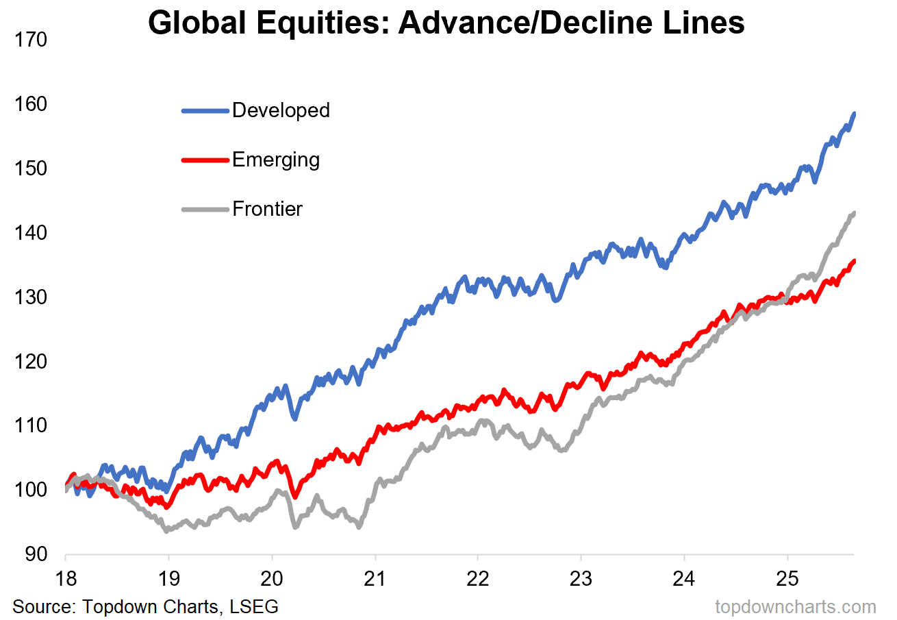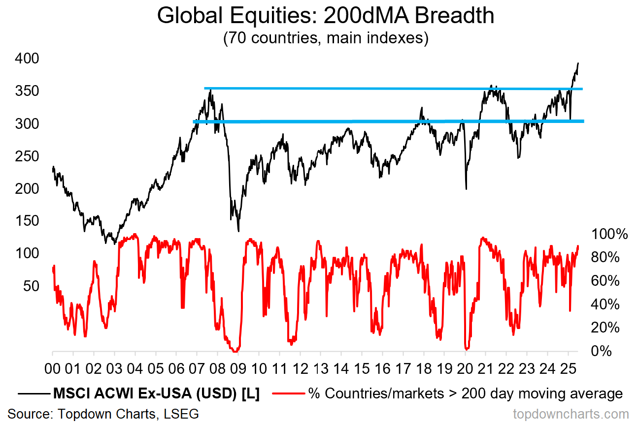 Technicals: global ex-US equities have broken out through a major long-term overhead resistance level to new all-time highs (i.e. the MSCI All Countries World Index, excluding USA). And they did it with strong (and improving) breadth.