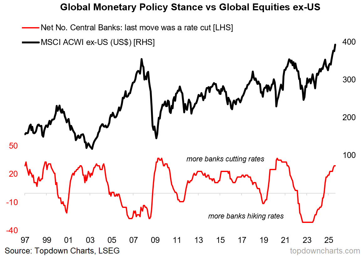 Monetary: while the Fed is a whole different issue, globally we’ve seen a widespread rush to rate cuts (which typically points to an acceleration in global growth and upside in stocks), the US dollar has also entered into a bear market, which helps global ex-US equities on multiple fronts (FX translation effects for US$ denominated investors, easier financial conditions, bullish self-reinforcing flows dynamics).