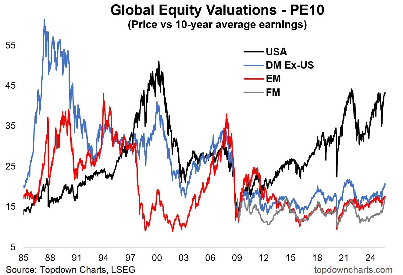 Now to be clear, we’re no longer as cheap as it was at the cheapest point, but we’re still looking at valuations across Developed, Emerging, and Frontier markets at historically low levels — and all at a major discount vs USA.