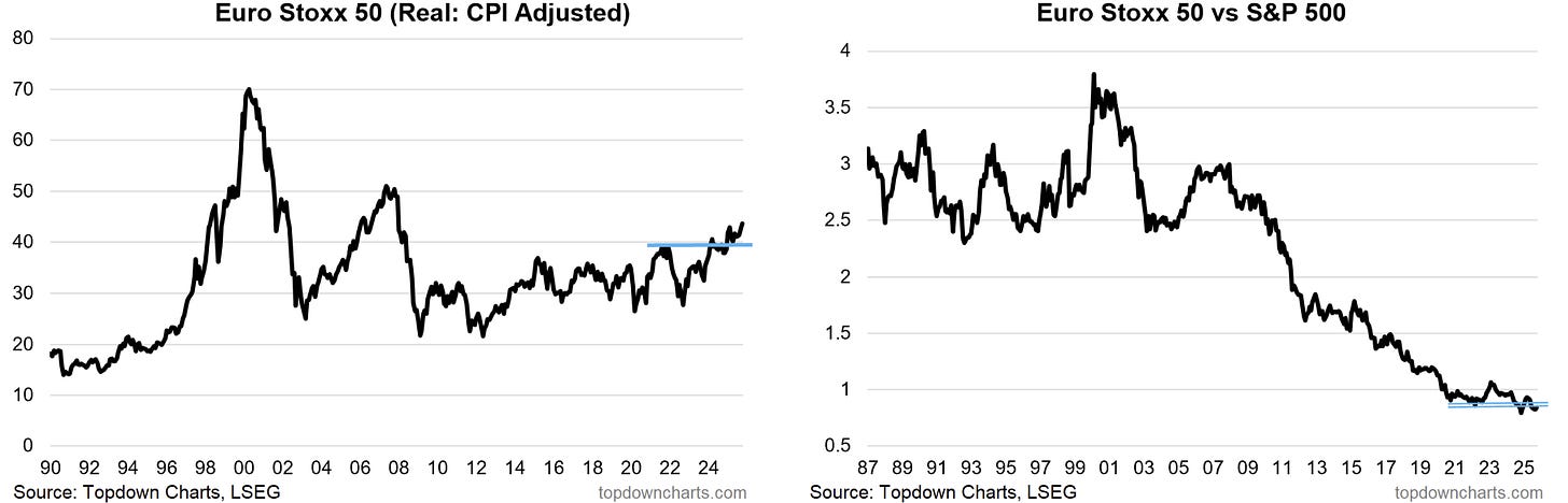 Another interesting angle on it is the CPI adjusted EURO STOXX 50 which —while looking less impressive than the chart above— has likewise undertaken a fairly compelling breakout also (albeit a very long way to go until new ATH on this one).