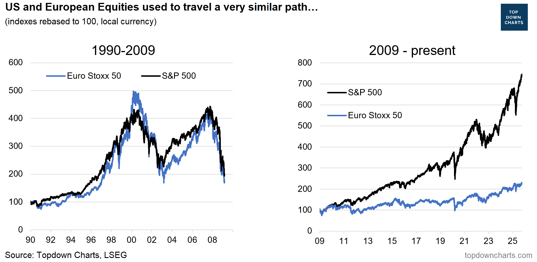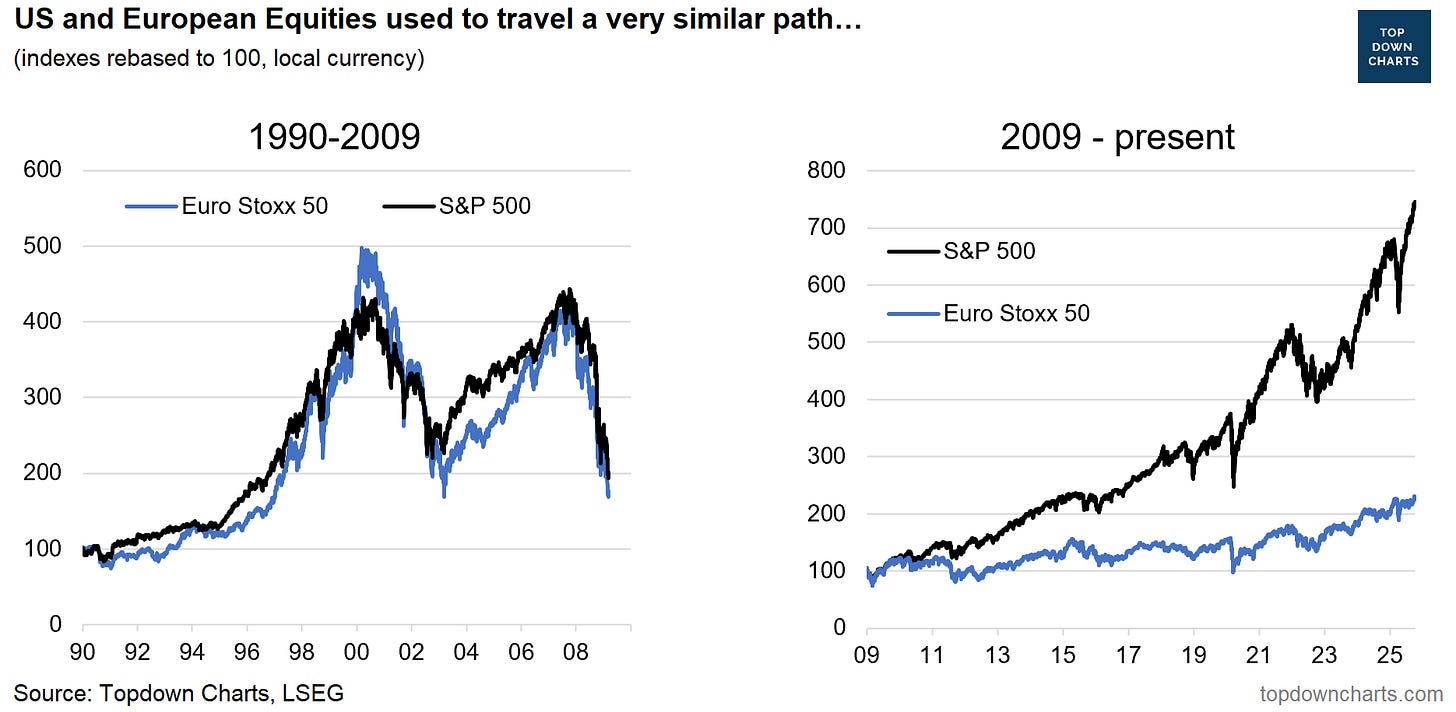 The USA on the other hand saw a decade+ of super-easy monetary policy + struck “tech stock oil” (and actual oil with the shale boom, and now “AI oil”). While it’s hard to see the USA coming unstuck or Europe striking its own oil, the thing to keep in mind is that the narrative and story usually only becomes obvious after price has moved… (a good final thought to muse on!)