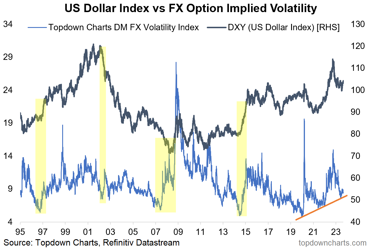 This week’s chart shows the US dollar index (DXY) vs an index I put together of 1-month FX options implied volatility for the USD vs developed market currencies. It’s a sort of similar idea to the stock market’s volatility index — the VIX.