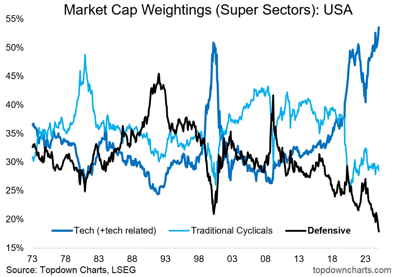 4. Sector Skews: This one speaks for itself – tech and tech-related sectors reaching new highs, while defensive sectors reached new lows in market cap weightings. Passive index investors take note: this is your portfolio now…!