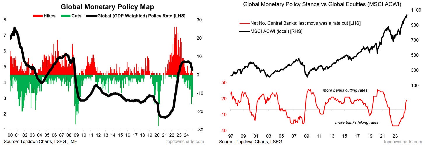 Bottom line: The pace and breadth of interest rate cuts globally is on par with the past 3 major global rate cutting cycles, however this time there’s no crisis/recession to deal with.