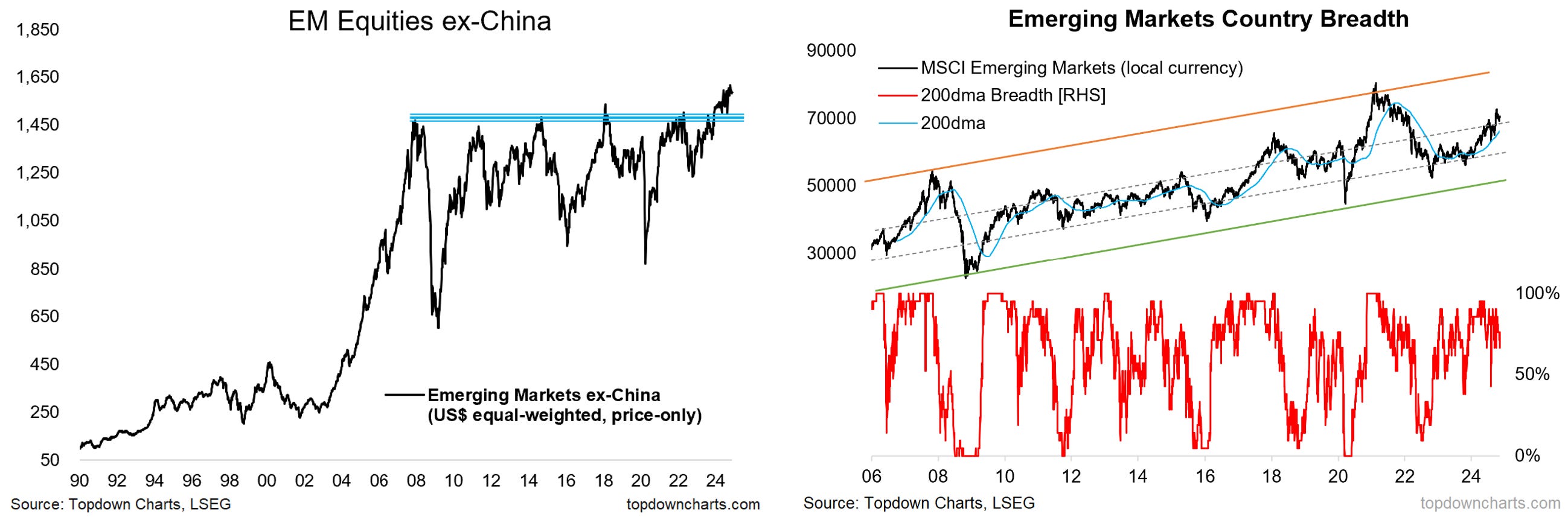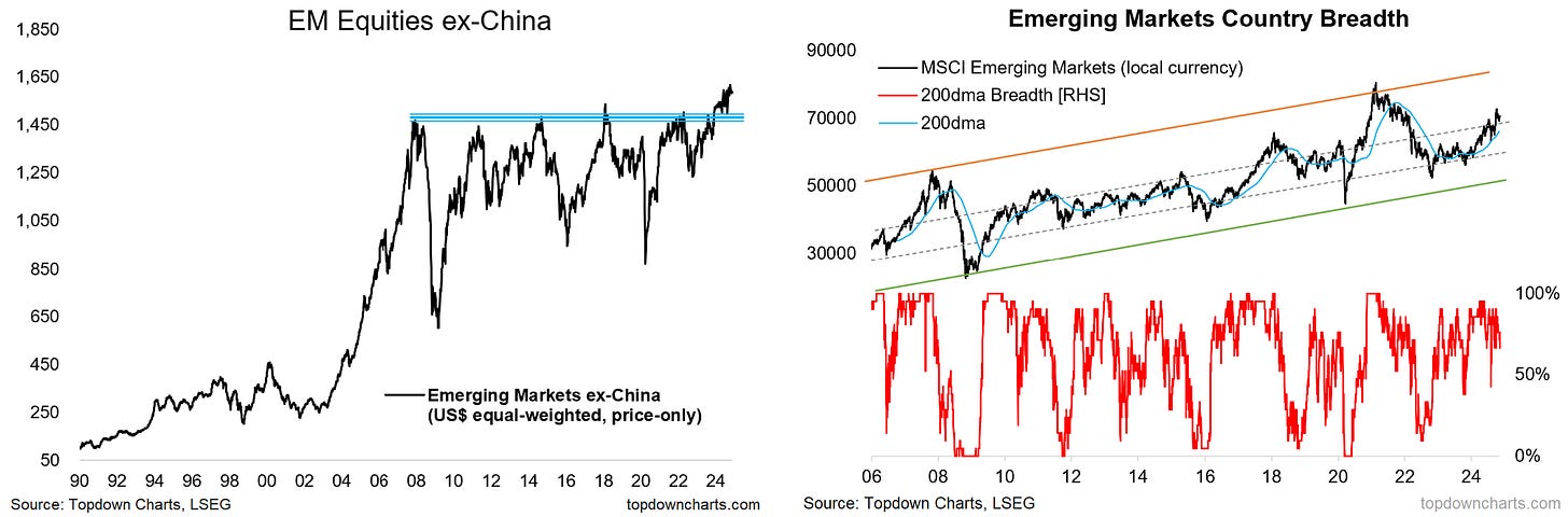 Zooming out and in on emerging markets, it was very volatile trading last week as markets struggle to make up their mind on the implications of a second Trump presidency and what it might mean for the array of macro and (geo)political factors that impact EM such as the US dollar, commodity prices, global trade, tariff risk, Fed rate cuts, China stimulus, to name a few. But bigger picture, the big breakout in Emerging Markets ex-China is still in play, and the MSCI emerging markets index in local currency terms remains in cyclical bull market mode; following it's long-term uptrend line.
