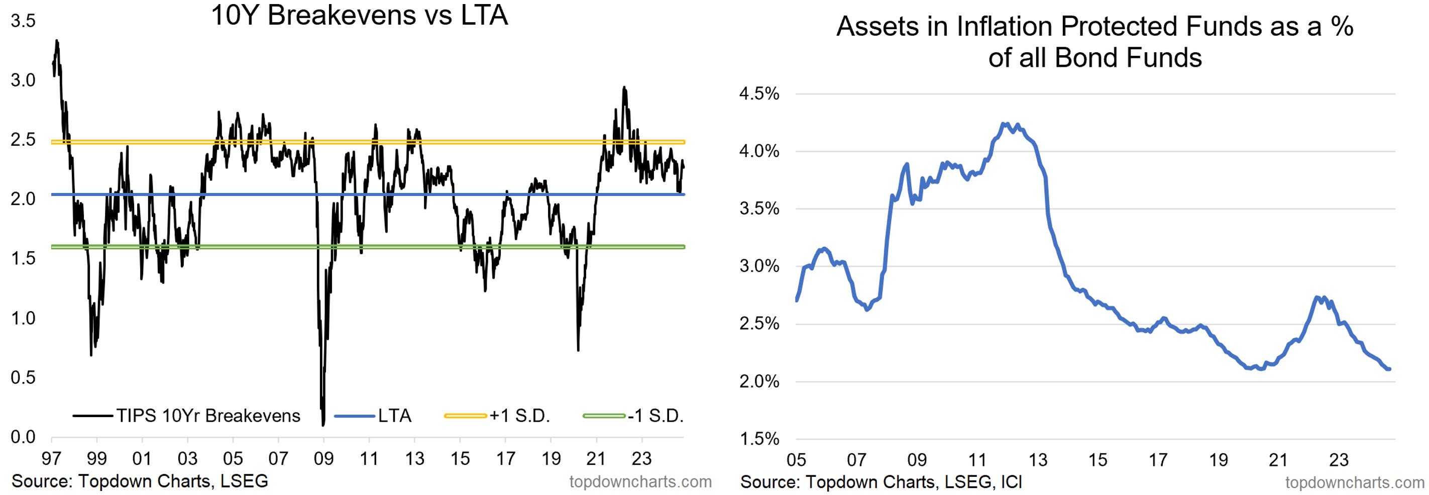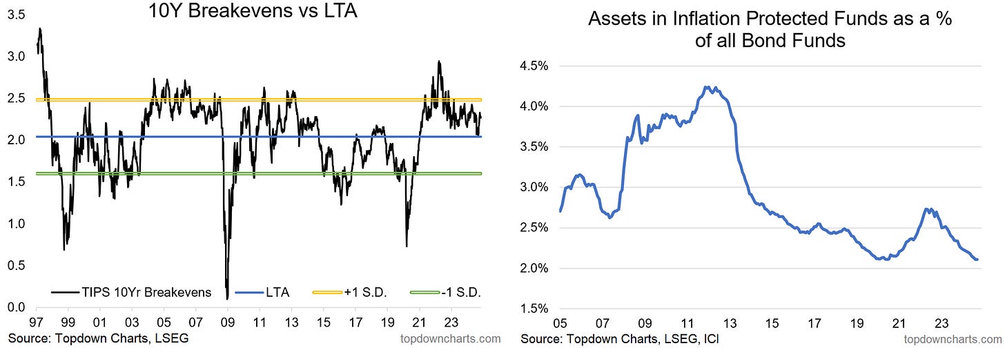 TIPS breakevens are not expensive, but definitely not cheap; could see some upside in the event of inflation resurgence. Interestingly, bond fund investors have lower allocations than usual to inflation protected funds.