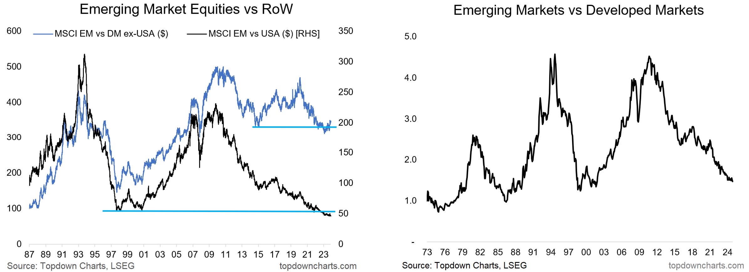 As for emerging markets vs the rest of the world, EM does seem to have turned the corner vs DM ex-US, but is still up against a high and moving hurdle set by the US. Looking at the longer-term chart the big cycle looks more due than ever to turn, but history does show that when it does turn the corner, it can be a multi-year work in progress.