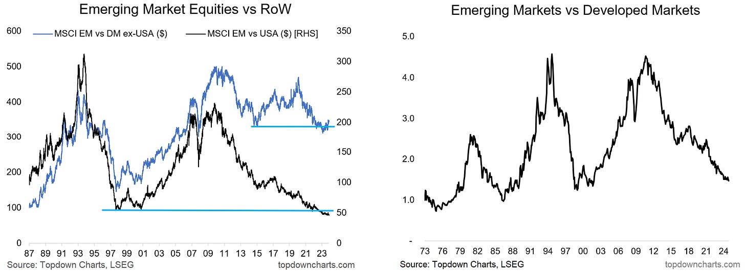 -On a relative basis, EM is making ground vs DM ex-US, but still struggling to turn the corner vs US stocks.