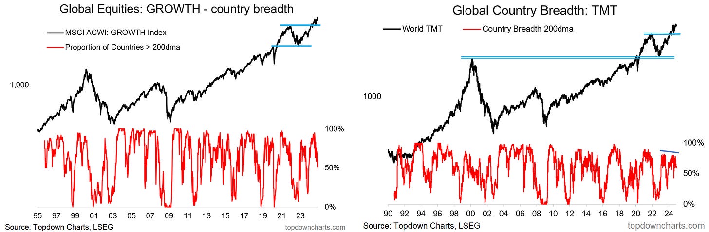 Globally growth/tech stocks are hitting the skids, cross-country breadth is rolling over and the world growth + TMT indexes are stumbling off the highs.
