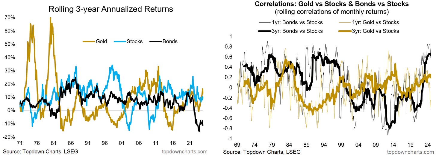 Diversify Diversifiers (some gold, some bonds) – both are viable substitutes, have differing and varying correlations to stocks, different volatility/risk over time, and different cycles of performance.