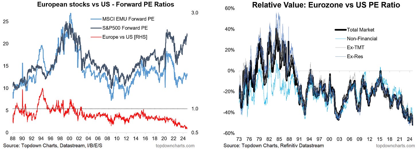 Bottom line: Similarly, European equities and EURUSD boast cheap relative value vs US, but the technicals and wider setup do not currently look promising, on watch for potential breakdowns.