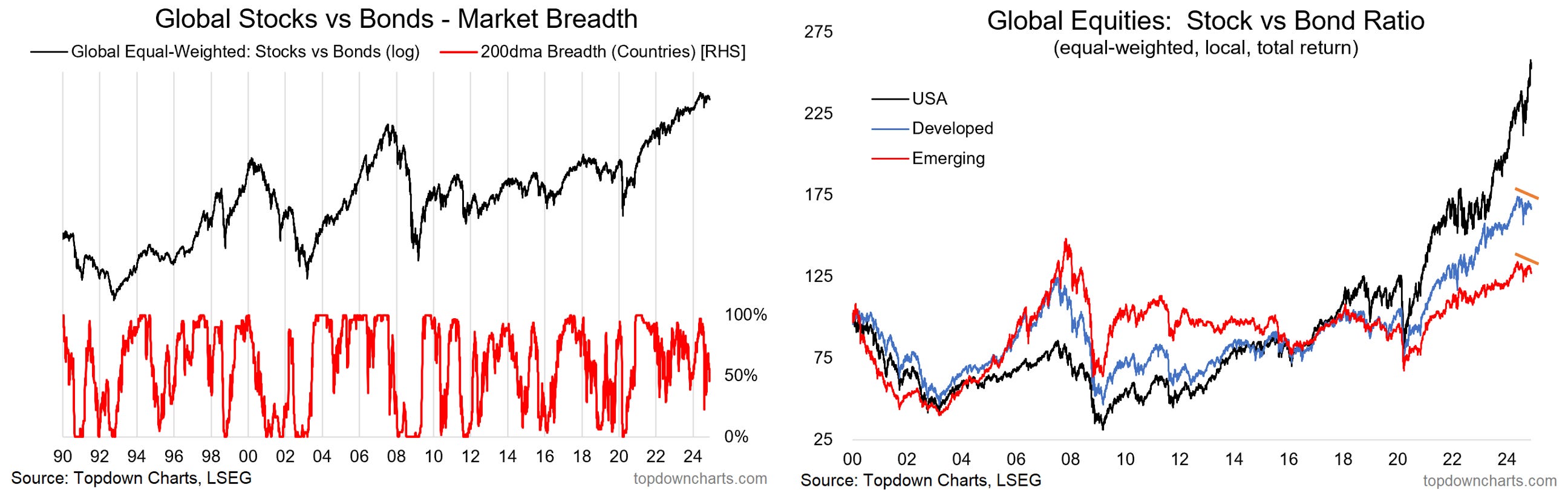 Another interesting snippet is the global equal-weighted stock/bond ratio peaked back in May, and cross country breadth of stock/bond ratios has been notably weaker. One interesting observation is how both developed and emerging markets are seeing their stock/bond ratios soften, while US is an outlier (always pays to watch for these types of divergences).