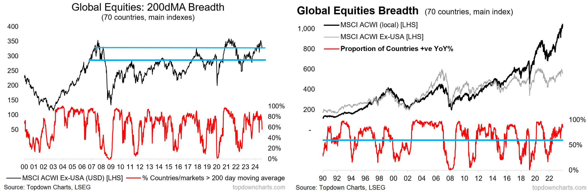-Global ex-US equities have pulled back to test support after failing to make new highs