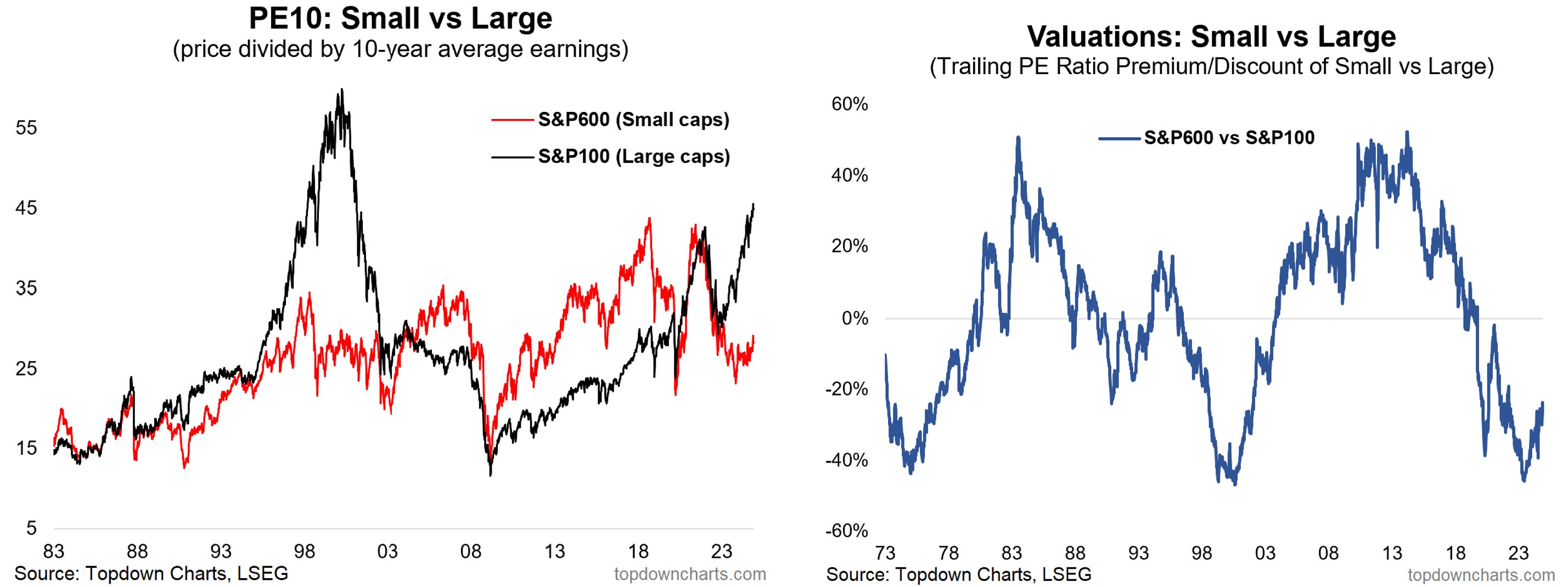 US small caps are significantly cheap vs history and cheap vs increasingly expensive large caps. Small caps are also much smaller than usual as a percentage of total US market cap (likewise for mid-caps).