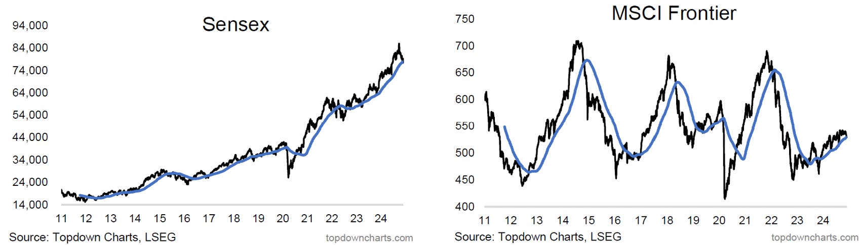 Stocks were mixed last week, US rebounded, Canadian stocks strengthened further, Europe and Japan slightly weaker, emerging markets mixed to weaker (with Indian stocks notably softer in recent weeks), frontier also pulling back slightly from the highs.